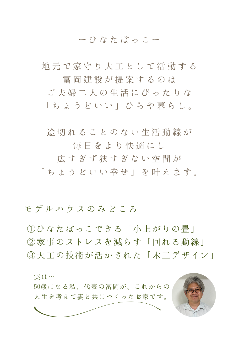 代表の私、冨岡(51歳)がこれからの暮らしを考え、夫婦で話し合って「こんな暮らしがしたいね」を実現したお家です。